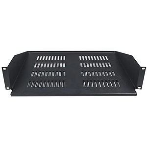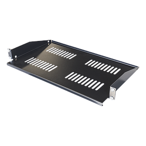 Toten 19" fixed shelf 2U, 267mm depth, max 8kg. It draws out 30mm from the 19" angles