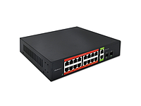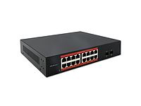 Qoltec unmanaged GE PoE switch, 16*RJ45 PoE (250W budget), 2*RJ45 uplink 10/100/1000Mb/s, 2*SFP 1000Mb/s